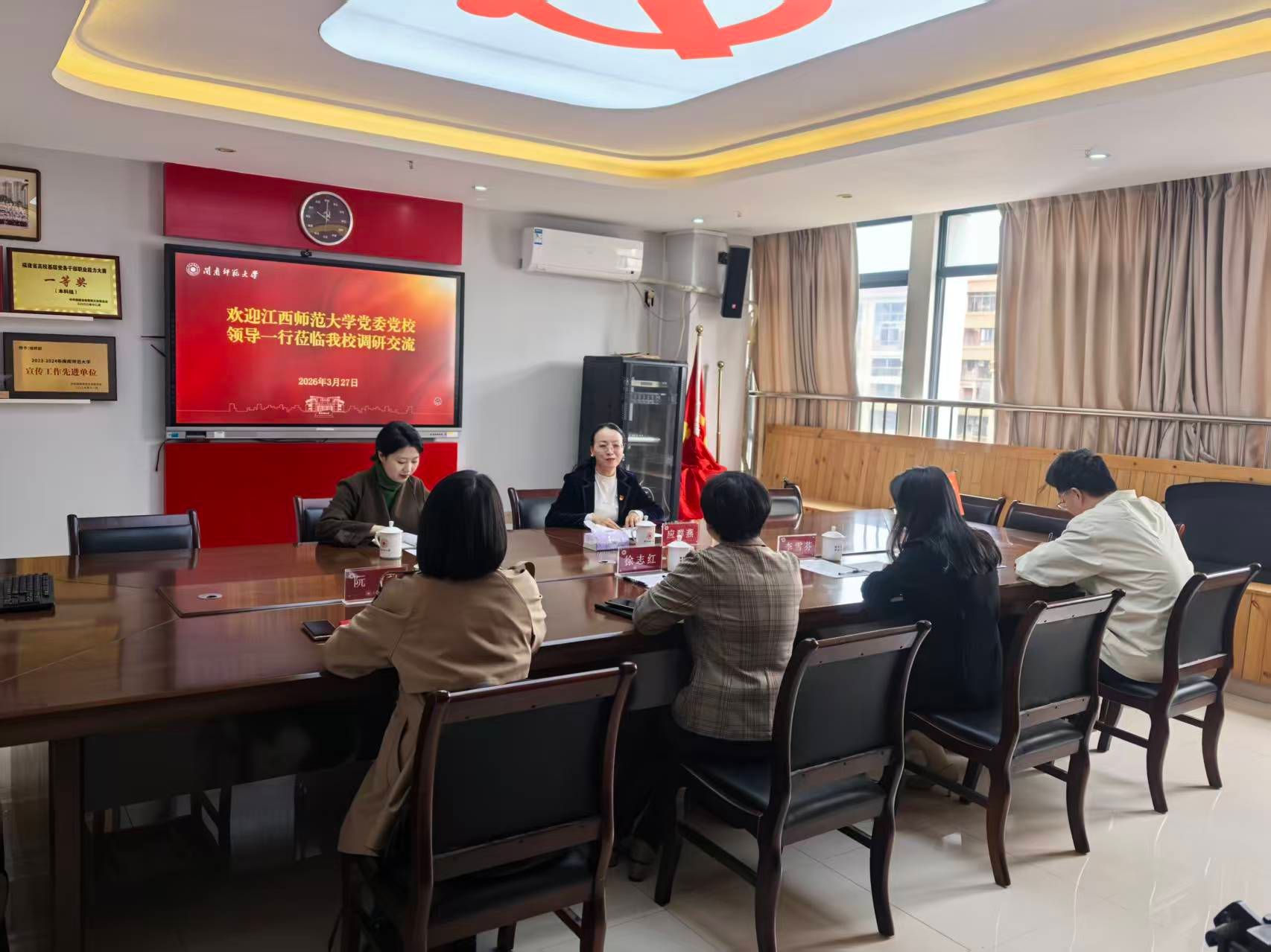 3月27日上午,江西师范大学党委党校副校长应群燕一行来我校调研交流。校党委组织部副部长、党校副校长徐志红、李雪芬及党校培训科相关人员参加调研座谈,徐志红主持会议。